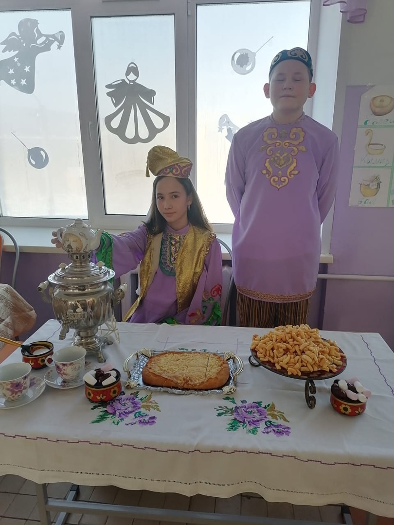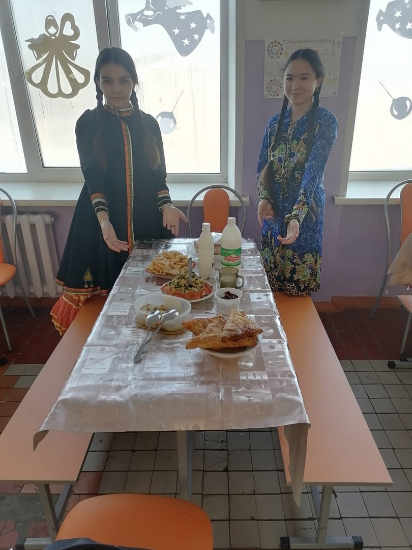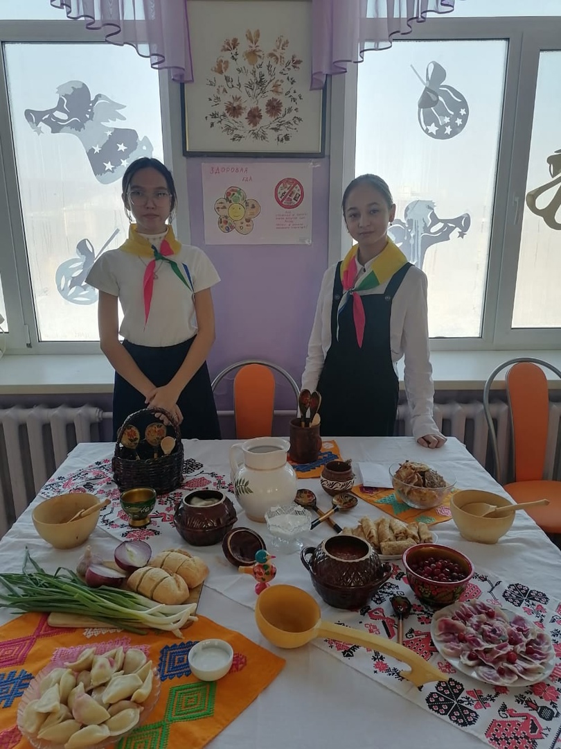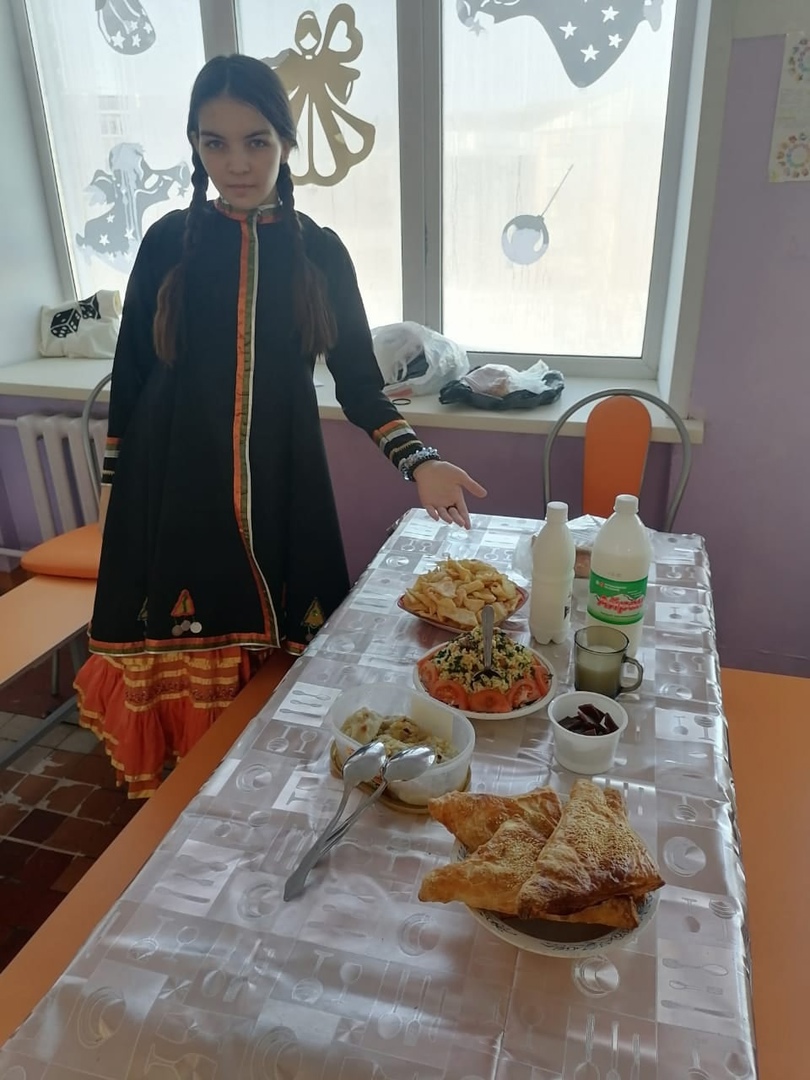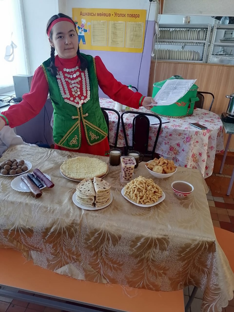 Учащиеся 7 классов участвовали в мероприятии "Моё национальное блюдо", каждый класс познакомил нас с " кухней" народов, проживающих на территории Башкортостана, были также показаны элементы костюмов, традиции разных национальностей, ну и, конечно, рецепты приготовления блюд .